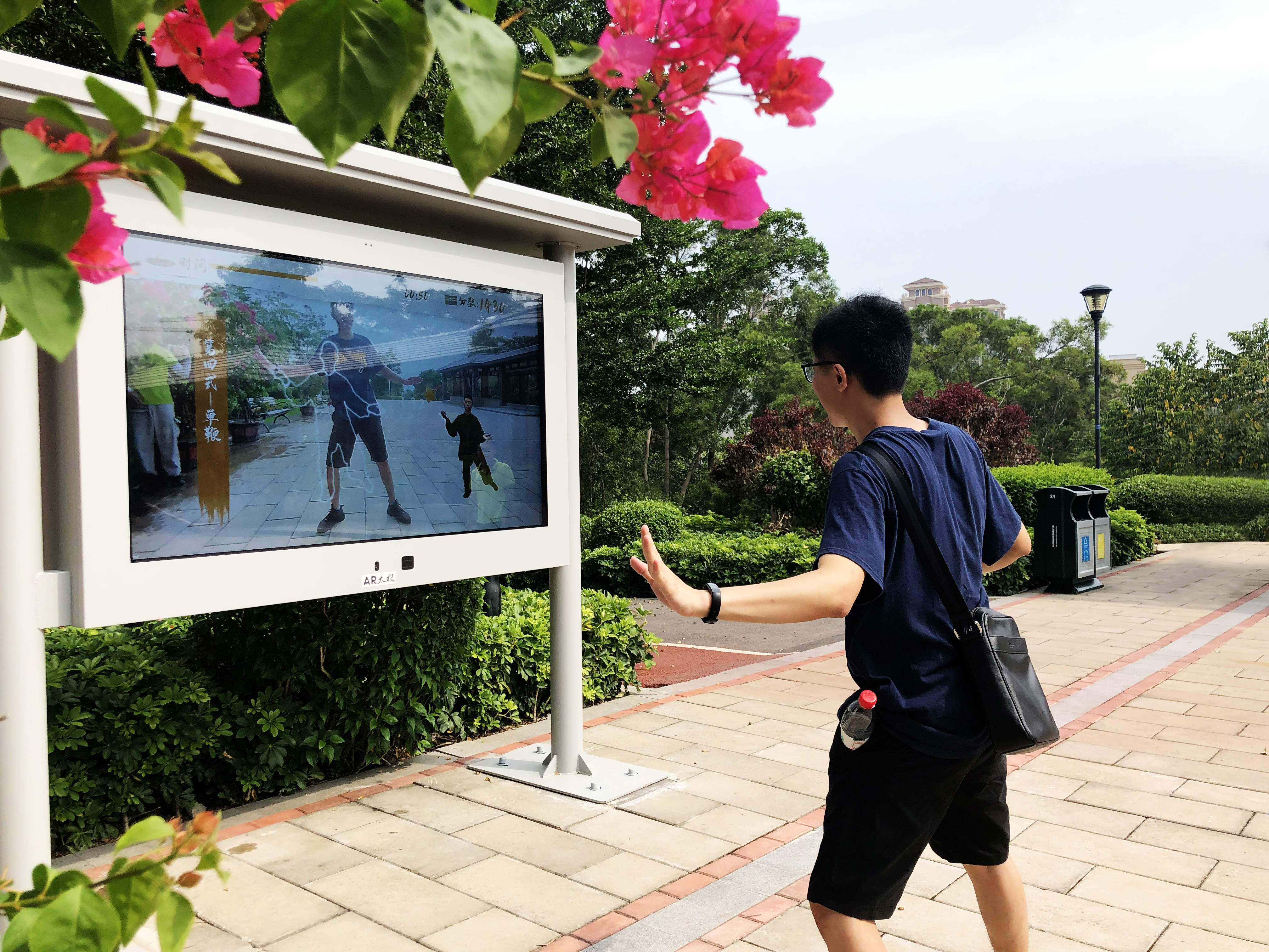 通過把太極拳/或廣場舞和AR技術、AI技術相結合,在公園設置一塊人工智能AI大屏,屏幕中會有太極大師教鍛煉者打太極,同時屏幕還會“檢驗”鍛煉者的學習情況:實時捕捉鍛煉者全身的關節點,將鍛煉者的動作與太極大師的動作比較并給出評判。